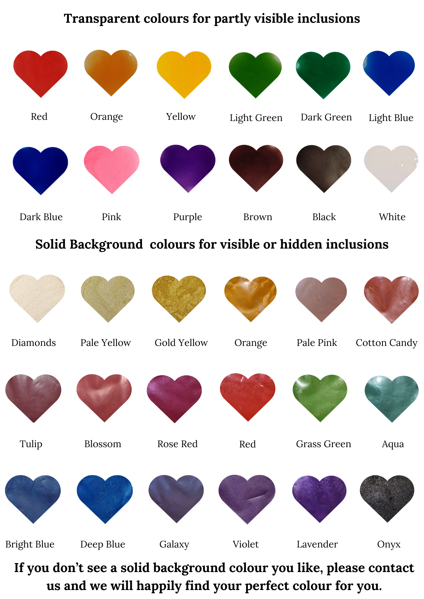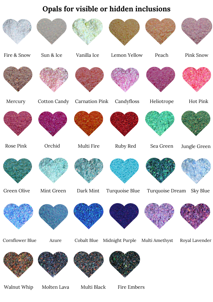 These are our beautiful Opal colours which are available for visible and hidden inclusions.