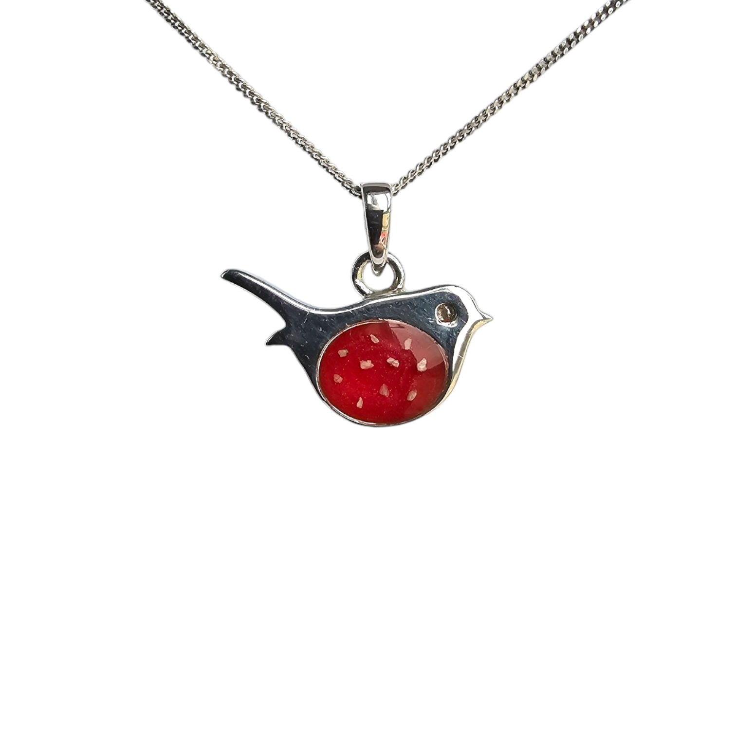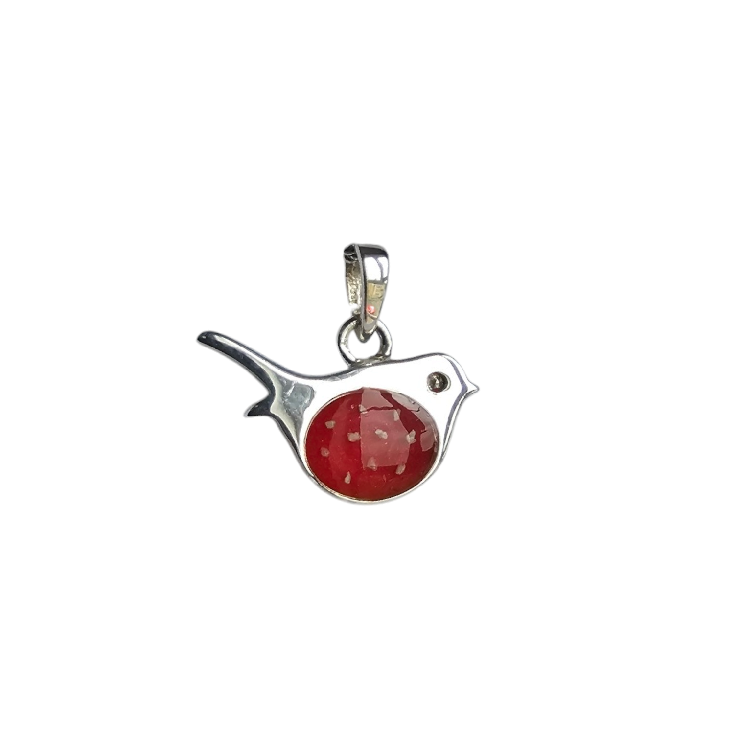 This is our stunning Robin Pendant. We can include a number of inclusions, such as ashes (human or animal), hair, fur, placenta, umbilical cord or breast milk in the setting. Please note there is a £10.00 surcharge for breast milk. Please also add the Breast Milk Surcharge to your order.